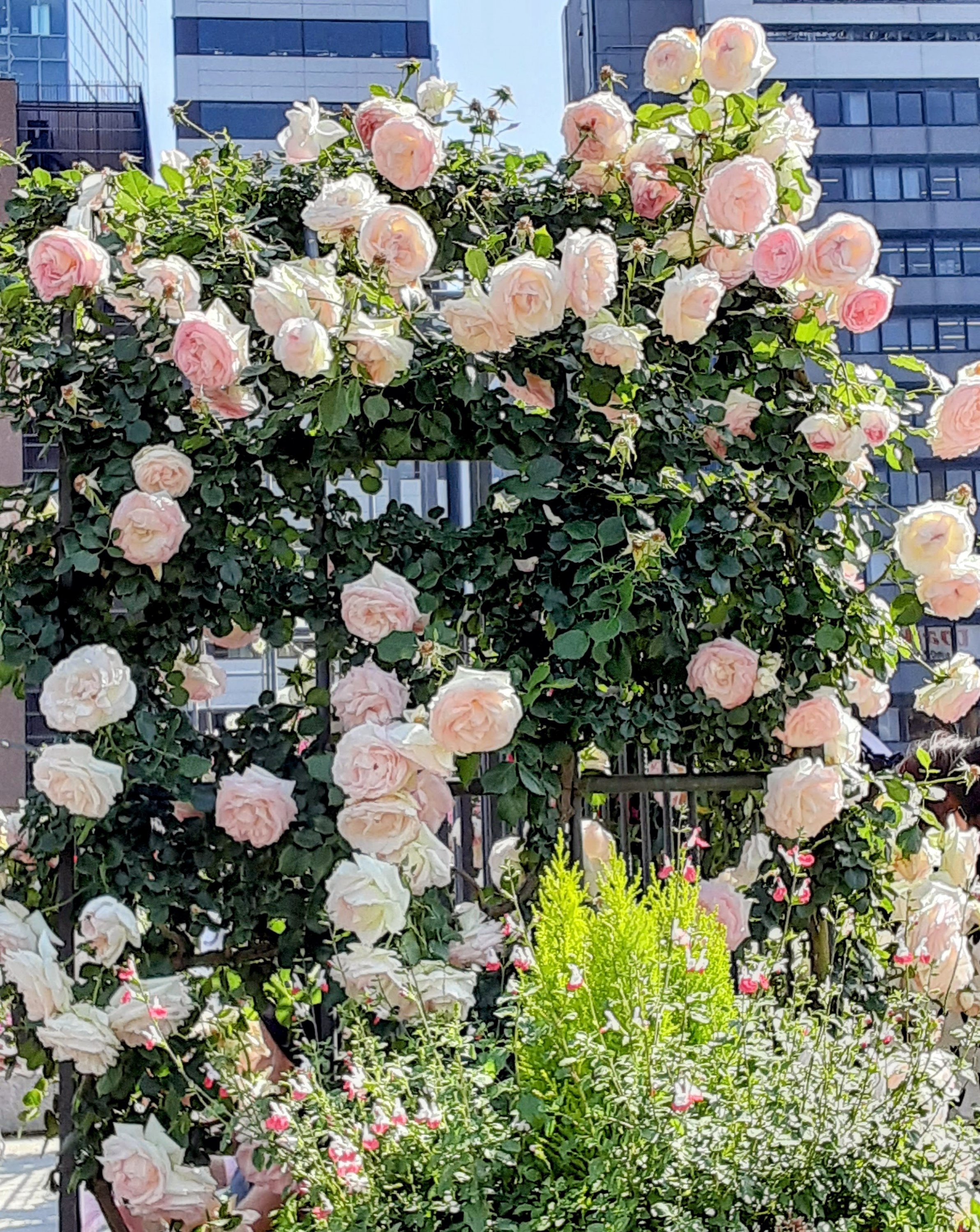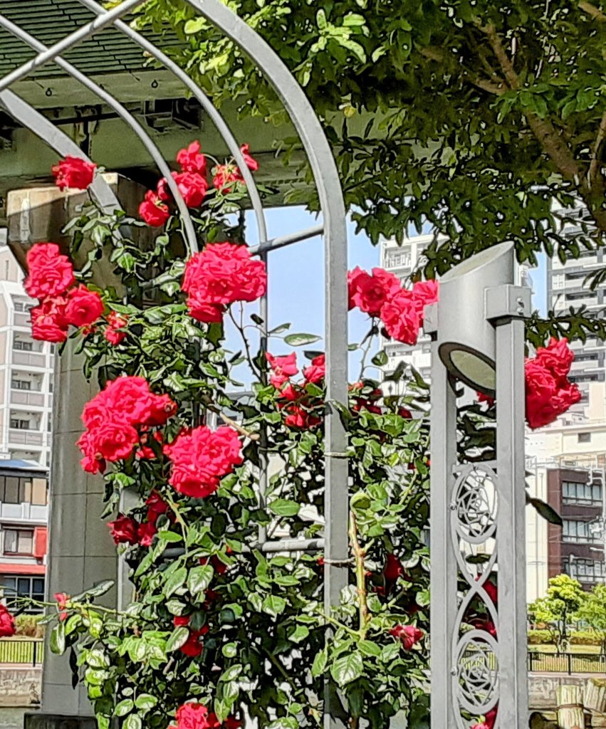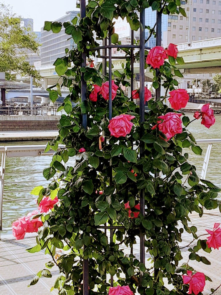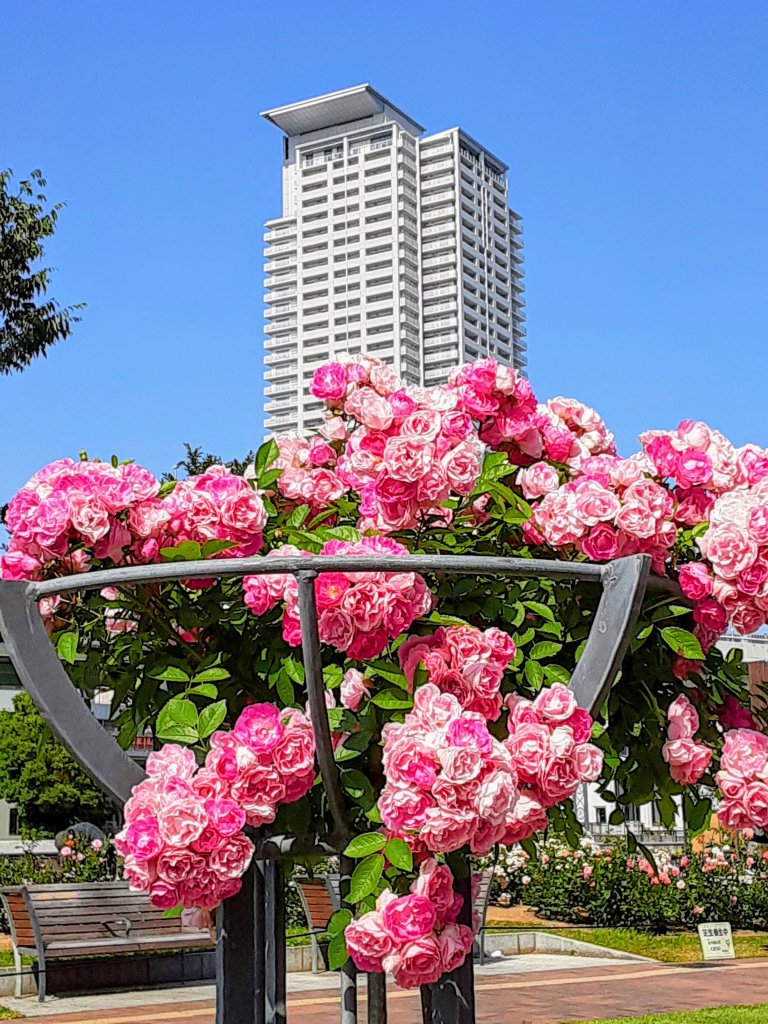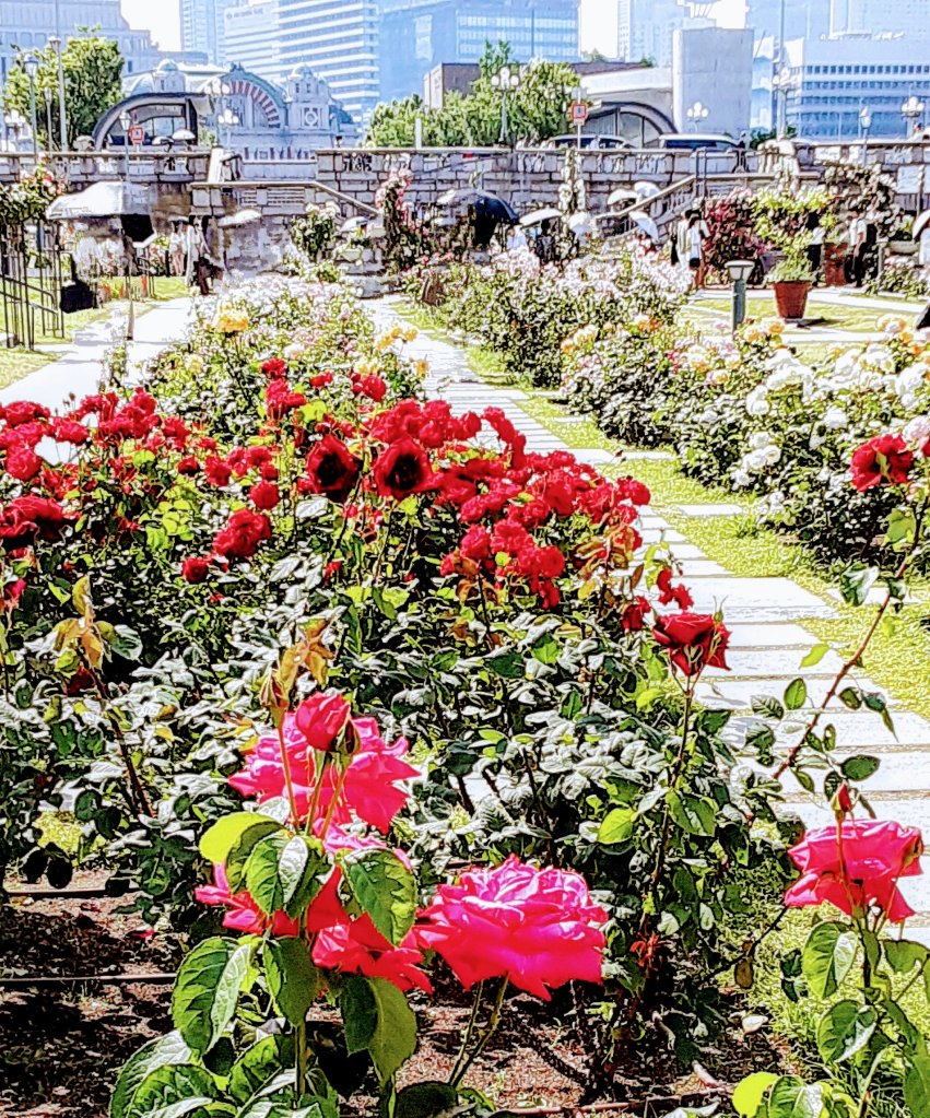 ※向こうに小さくみえるのは、立派な公会堂です。あまりの暑さの下でバラ に夢中になっていたので、また別の日に訪問します。